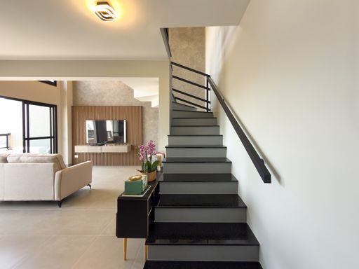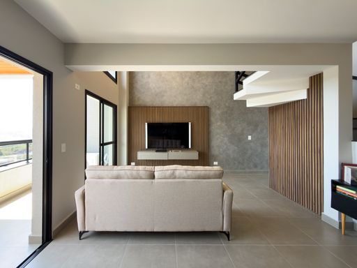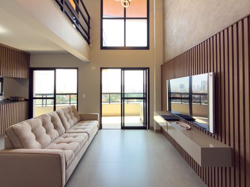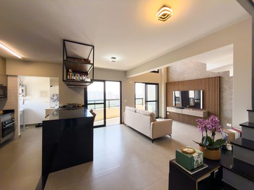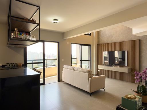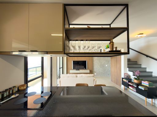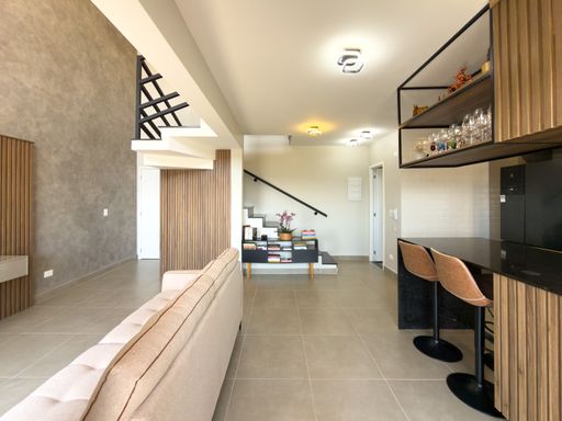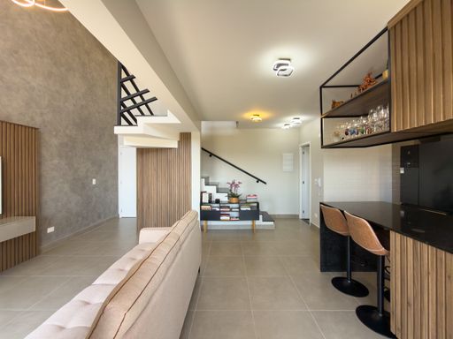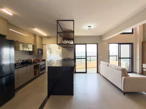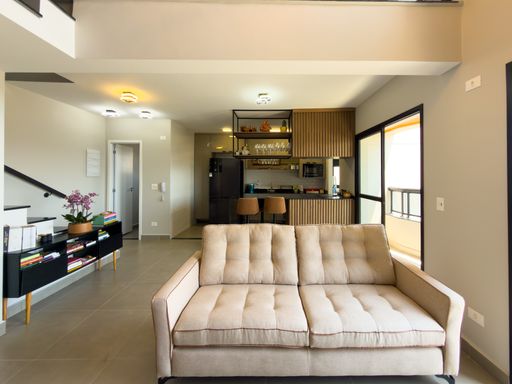 Sofá, banquetas, móveis planejados: sala, cozinha e quarto.